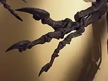 Передние лапы аллозавра были относительно короткими по сравнению с задними (у взрослых лишь около 35 % длины задних конечностей), на них имелись три пальца, которые кончались крупными, сильно изогнутыми когтями. Предплечья были несколько короче, чем плечи (соотношение длины плечевой и локтевой кости равнялось примерно 1:1,2); запястье равнялось по длине локтевой кости. Из трёх пальцев на передней лапе средний был самым крупным и отличался от других количеством фаланг. Ноги аллозавра были приспособлены не столько для быстроты передвижения, сколько для устойчивости. На ноге имелось три опорных пальца, и один, не использовавшийся при ходьбе. Также есть признаки того, что на задней лапе был и пятый рудиментарный палец. Скорость бега аллозавра оценивается в 30—55 км/ч; скорее всего, это был очень подвижный охотник[15].