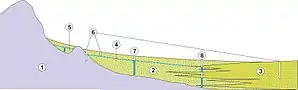 - прирусловая (внешняя) — составлена из наиболее крупнозернистого материала с плохой сортировкой за счёт резкого изменения скоростей суспензионного потока. Это преимущественно крупнозернистые плохо сортированные пески различного минерального состава, которые формируют ядра и склоны прирусловых валов.