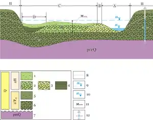 - проточный (нижний): фация сезонного заиления — составлена чередованием тонкозернистых песков, супесей и суглинков, которые образовались во время периодического обновления стока старым руслом во время наводнения или паводка.
