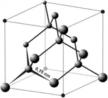 Кристаллы кубической сингонии (гранецентрированная решётка), пространственная группа Fd3m, параметры ячейки a = 0,357 нм, Z = 8. Атомы углерода в алмазе находятся в состоянии sp³-гибридизации. Каждый атом углерода в структуре алмаза расположен в центре тетраэдра, вершинами которого служат четыре ближайших атома. Именно прочная связь атомов углерода объясняет высокую твёрдость алмаза.