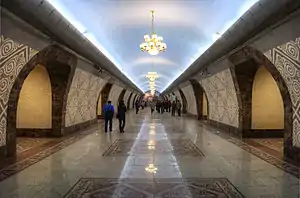 Пилонная трехсводчатая станция глубокого заложения (глубина - 30 м) с междупутьем 25 м. Состоит из трёх залов — центрального и двух боковых, которые образуют общую островную платформу шириной 19,8 м, длиной 104 м. Спуск-подъем на станцию по эскалаторам (4 ленты) высотой подъёма 29,0 м, длиной 58,0 м.