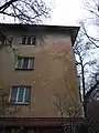 Южный торец дома по адресу улица Байсеитовой 47, находящийся в 130 метрах севернее Площади Республики в Алматы. При увеличении снимка на стене видны следы от пуль, оставшиеся после силовой зачистки площади вечером 6 января 2022 года.