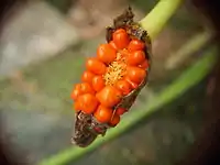 Початок несколько короче или почти равен покрывалу, 6—13 см длиной, на ножке; ножка беловатая, коническая, около 5 мм длиной. Женская цветочная зона цилиндрическая, 1—1,5 см длиной; завязь шаровидная, около 1,5—2 мм в диаметре, зелёная; рыльце белое, полусидячее или на тонком столбике около 0,5 мм длиной, остро и заметно трёх- или четырёхлопастное; лопасти точечные, более-менее раскидистые, белые. Стерильный промежуток 7—10 мм длиной, более узкий, чем репродуктивные зоны, сжатый в месте перетяжки покрывала; синандродии нижние часто с не полностью сросшимися тычинками, остальные удлинённо- ромбо-шестиугольные, плоско-усечённые. Мужская цветочная зона цвета слоновой кости, полуцилиндрическая, суженная в основании, 1,2—2,5 см длиной, 4,5—8 мм в диаметре; синандрии с 4—6 тычинками, более-менее шестиугольные, около 2 мм в диаметре. Придаток 3,5—9 см длиной, той же толщины, что и мужская зона, отграничен от неё слабым сжатием, полуцилиндрический, конусовидно сужающийся к вершине, от очень бледно-оранжевого до ярко-жёлтого.