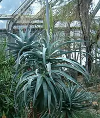 Стебель прямой, высота до 2 м (изредка может достигать в высоту 4 м). Листья расположены розеткой на верхушке стебля. Форма листьев линейно-ланцетная, поверхность серо-зелёного цвета, края зубчатые, длина до 65 см. Цветки трубчатые, изогнутые, как правило, оранжевого цвета, длина до 5,5 см. Цветение происходит зимой или весной (с июля по сентябрь). Семена образуются в капсулах и разносятся ветром.