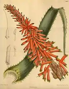 Цветки крупные (длиной до 40 мм и шириной около 5 мм), колокольчатые, трубчатые, поникающие, шестилепестные, на тонких цветоножках, достигающих 2,5 см длины. Цветки собраны в пазушные, густые цилиндрические кистевидные соцветия 20—40 см длиной, растущие на длинных, прямых или слегка изогнутых цветоносах. Прицветники лопатчатые, тупые, по краям плёнчатые, 15—25 мм длиной. Лепестки линейные, расположены в два круга; три лепестка наружного круга — оранжевые, более плотные, три внутренних лепестка — плёнчатые, белые, с заметно выдающейся оранжевой срединной жилкой. Тычинок шесть, равных околоцветнику или немного из него выступающих, также расположенных в два круга; тычиночные нити наружного круга немного короче, к основанию расширяющиеся, пыльники ярко-оранжевые. Пестик с верхней трёхгнёздной завязью, нитевидным столбиком и едва заметным рыльцем.