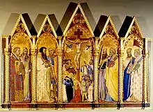 В готическую эпоху, особенно начиная с XIV века, алтарная картина претерпевает большие изменения — она принимает формы стрельчатой архитектуры, иногда ещё просто прямоугольной, но увенчанной «аркой в форме митры». Уже тогда появляются боковые створки, окружающие центральную картину. Так возник полиптих.