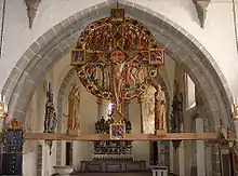 Алтарная преграда (англ. rood screen, choir screen, chancel screen, фр. jubé[3], итал. tramezzi) — элемент западноевропейского церковного здания позднего средневековья. Представляет собой украшенную более или менее прозрачную перегородку между нефом и алтарной частью храма. Преграды по материалу бывают каменные, деревянные и кованые. Изначально преграды увенчивались большим скульптурным распятием[4]. В соборах, монастырских и коллегиальных церквях Англии, Шотландии и Уэльса обычно было две преграды, одна западнее, увенчанная распятием, вторая, более плотная и богато украшенная — на одну секцию восточнее первой[5], но оригинальный комплект нигде не сохранился. В Уэлском соборе в XX веке конструкция с двумя преградами была воссоздана: под средневековой аркой устроена преграда с распятием, а дальше расположена преграда, на которой сидит орган.