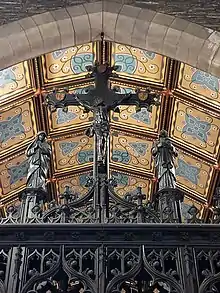 Обычно на преграде по сторонам венчающего её распятия располагаются скульптуры святых, как правило, Марии и Иоанна[7], что совпадает с иконографией деисусного чина в центре православного иконостаса (только в православии обычно центральный образ — Пантократор, а вместо апостола Иоанна — Креститель). Позднее в Англии и Уэльсе распятие поднялось выше над верхним ярусом преграды, который в этом случае бывал столь велик и прочен, что мог служить галереей для хора и даже мог нести алтарь; хотя изначально был предназначен лишь для свечей, освещающих рапятие[8]. Стойки и заполнения преграды не поддерживают верхнего яруса, который покоится на самостоятельной балке-опоре[9], подняться на него можно по специальной лестнице сквозь столбы, поддерживающие заалтарную арку. В приходских церквях пролёт арки над преградой (люнета) часто был заполнен досками или штукатуркой и расписан на сюжет Страшного суда[10]. Потолок первой секции нефа над алтарём обычно бывает щедро украшен, или же устраивается специальный балдахин.
