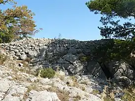 Укрепление располагается на довольно плоской вершине горы, наклонённой к западу и пересечённой разломами, окружённой почти со всех сторон обрывами в 70—80 м, на которое с севера и юга идут дороги. Площадка имеет размеры 250 на 120 м[1] — самое большое укрепление на Южном берегу Крыма[4][5]. Стены крепости, длиной около 600 м при ширине стены 1,8—2 м (кое-где сохранились на высоту до 2,2 м), были сложены из бута на известковом растворе, ограждали плато с 3 сторон, четвертую — лишь частично, благодаря скальным обрывам и делили городище на три части: в самой верхней, с трёх сторон ограниченной обрывами, размещалась цитадель (площадью 0,17 гектара), также огороженная стеной с прямоугольной башней (4 на 4 аршина[4]), внутри цитадели находилась небольшая церковь. Средняя часть (площадью около 1,35 гектара), видимо, представляет собой предполье цитадели; заселена была нижняя часть плато — застроена небольшими домами в 1—2 комнаты.
