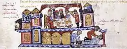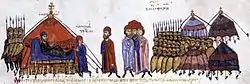 ![]() Алусиан (в центре) предстает перед Петром II Деляном и болгарским лагерем. Миниатюра из «Мадридского Скилица». | |
