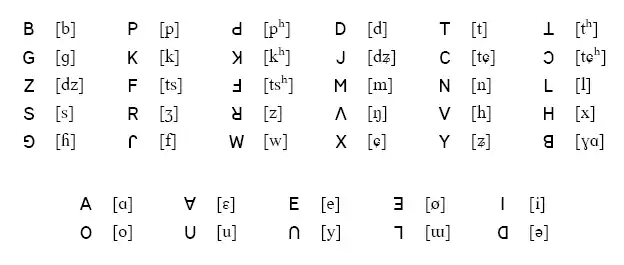 В основе алфавита лежат заглавные буквы латинского алфавита. Также используются знаки, представляющие собой перевёрнутые сверху вниз или слева направо заглавные латинские буквы. Тоны обозначаются европейскими пунктуационными знаками.