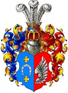 В щите рассечённом, в правом лазоревом поле два кавалерских креста золотых и меж ними подкова серебряная, шипами вниз обращённая (изменённый польский герб Любич). В левом червлёном поле орлиное крыло серебряное. Щит увенчан дворянскими шлемом и короною со страусовыми перьями. Намёт на щите лазоревый и червлёный, подложенный золотом.