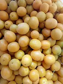 Плоды — округлые сочные в состоянии спелости — жёлтые, розовые, красные, фиолетовые или почти чёрные костянки до 3 см в поперечнике, иногда удлинённые или приплюснутые, с лёгким восковым налётом и слабой продольной бороздкой и без неё. Созревают в июне — сентябре[2].