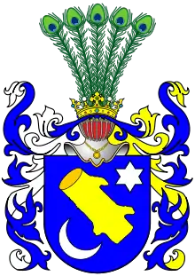 Щит увенчан дворянскими шлемом и короной. Нашлемник: павлиний хвост. Намёт на щите лазоревый, подложенный серебром и золотом.