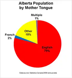 Перепись населения 2006 года установила, что английский язык, с 2 576 670 носителей языка, был наиболее распространённым родным языком Альберты, что составляет 79,99 % населения провинции. Следующим наиболее распространённым родным языком были разные китайские диалекты с носителями языка 97 275 (3,02 %), а затем с родным немецким 84 505 (+2,62 %) и французский язык с 61 225 (1,90 %). Другими распространёнными родными языками (в порядке убывания) являются: панджаби, с носителями языка 36 320 (1,13 %); тагальский, с 29 740 (0,92 %); украинский, с 29 455 (0,91 %); испанский язык, с 29 125 (0,90 %); польский язык, с 21 990 (0,68 %); арабский язык, с 20 495 (0,64 %); голландский язык, с 19 980 (0,62 %) и вьетнамский язык, с 19 350 (0,60 %). Самый распространённый язык коренных народов — кри — 17 215 (+0,53 %). Другие распространённые родные языки включают итальянский язык с 13 095 носителей (0,41 %); урду с 11 275 (0,35 %) и корейский язык с 10 845 (0,33 %), а затем хинди 8985 (0,28 %); персидский язык 7700 (0,24 %), португальский язык 7205 (0,22 %) и венгерский язык 6770 (0,21 %).