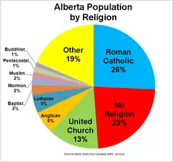 По состоянию на 2001 год крупнейшие религиозные группы это: Протестантизм-26,7 % населения, римско-католическая, что составляет 25,7 % населения. Альберта имеет второй самый высокий процент нерелигиозных жителей в Канаде (после Британской Колумбии) в 23,1 % населения. Протестантские деноминации состоят из: 13,5 % принадлежащими к Объединённой церкви Канады, а 5,9 % были англиканской. Лютеране составляют 4,8 % населения, в то время как баптисты, составили 2,5 %.