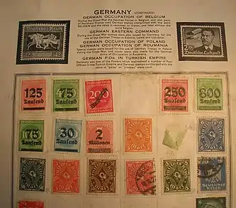 Лист альбома с предусмотренными местами для марок, но без их изображений, и с указанием сведений по каждой стране (на примере марок германской почты за границей)