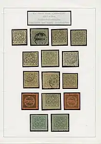 Альбомные листы[10] почти всегда односторонние. Двусторонние листы экономят место, но требуют их прокладывания промежуточными листами из тонкой бумаги для недопущения сцепления марок друг с другом.