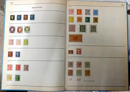 | Пример цветного, (частично) иллюстрированного альбома фирмы «Стэнли Гиббонс» (Великобритания, 1983) с двусторонними листами[11] |