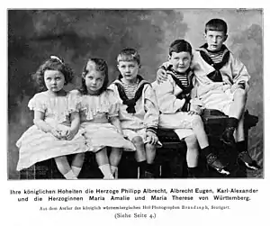 - Филипп Альбрехт (1893—1975) — титулярный король Вюртемберга, дважды женат, имел семерых детей от двух браков;