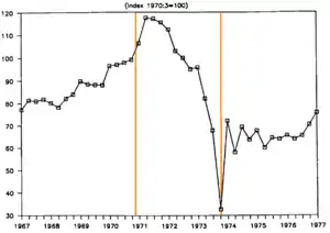 В ноябре 1972 года Чили объявила частичный мораторий на выплату внешнего долга (то есть дефолт), что ускорило бегство капиталов и подстегнуло инфляцию. Несмотря на экономический рост, инфляция составляла 22,1 % в 1971 году благодаря административному контролю за ценами, в первой половине 1972 года она поднялась до 28 %, во второй половине 1972 года составила 100 %, а в первой половине 1973 года 353 %[15].