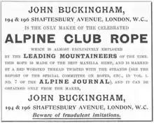 Альпинистам для восхождений требовалась особая верёвка: достаточно прочная и одновременно лёгкая, чтобы верёвку необходимой длины можно было легко переносить. В клубе был образован специальный комитет для испытания образцов верёвки различных производителей и выработки спецификаций на неё. По итогам этих проверок была утверждена «официальная верёвка Альпийского клуба» (англ. The official Alpine Club Rope). Ею стала верёвка производства Джона Бакингема (англ. John Buckingham) из Блумсбери (это коммерческое предприятие существует и сегодня, но под другим наименованием: «Arthur Beale»). Официальная верёвка клуба была изготовлена из трёх прядей манильской пеньки, прошедшей обработку против гниения, и маркировочной нити из красного гаруса.[1]