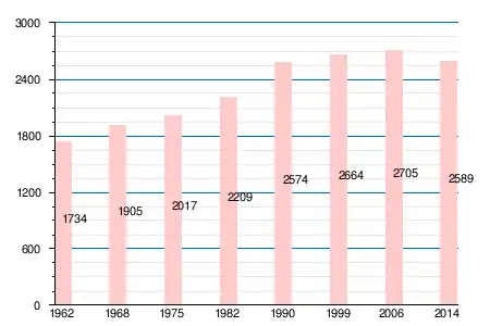 | 1734 | 1905 | 2017 | 2209 | 2574 | 2664 | 2705[4] | 2638[7] | 2589[5] |