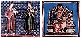 Две миниатюры из Las Cantigas de Santa Maria (XIII c.), иллюстрирующие два способа игры на смычковых: слева da braccio, справа — da gamba