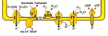 Альтернативная оксидаза прямо восстанавливает O2 до H2O, окисляя пул убихинонов, и рассеивает энергию в виде тепла. Однако при таком механизме по крайней мере 2 из 3 пунктов сопряжения теряются, и потенциально генерация градиента протонов возможна только на комплексе I при окислении НАДН, что значительно снижает конечный выход АТФ[6].