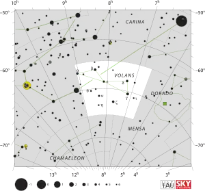 Альфа Летучей Рыбы (α Volantis, α Vol) — двойная звезда[11] в созвездии Летучей Рыбы. Видимая звёздная величина составляет +4.00, что достаточно для наблюдения невооружённым глазом. На основе измерения годичного параллакса была получена оценка расстояния от Солнца, равная 125 световым годам. По состоянию на 2010 год два компонента звёздной системы были разделены угловым расстоянием 0,0318 угловой секунды при позиционном угле 286,9°. Разность звёздных величин двух компонентов составляет 0,1.[12] Возможно, является представителем сверхскопления Сириуса.[5]