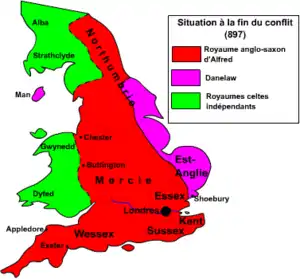 По заключении Уэдморского мира Альфред занялся укреплением и организацией своего королевства. Права на присоединённые земли он укрепил, заключая ряд брачных союзов членов своей семьи с королевскими домами Мерсии и Восточной Англии. В своём личном владении он оставил собственно Уэссекс, верхнюю часть долины Темзы, долину Северна, а также плодородные равнины Мерси и Ди из территории бывшего королевства Мерсия, которые с того времени и стали называться Мерсией. Остальная часть бывшей Мерсии, оставшаяся во власти датчан, стала называться Пять Датских городов[10].