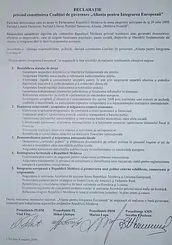 Соглашение о создании коалиции Альянс за европейскую интеграцию I было подписано 8 августа 2009 года Владимиром Филатом, Михаем Гимпу, Марианом Лупу и Серафимом Урекяном. Лидеры партий, вошедших в альянс, заняли ключевые должности в государстве: лидер ЛДПМ Владимир Филат стал премьер-министром, председатель ЛП Михай Гимпу был избран председателем парламента и исполняющим обязанности Президента, лидер ДПМ Мариан Лупу стал кандидатом АЕИ на должность Президента, однако не был избран из-за нехватки голосов, лидер АНМ Серафим Урекян стал первым заместителем председателя парламента.