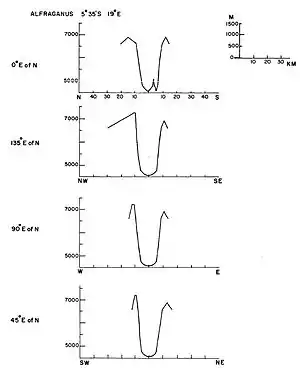 На приведенном графике представлено сечение кратера в различных направлениях[5], масштаб по оси ординат указан в футах, масштаб в метрах указан в верхней правой части иллюстрации.