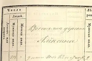 Наиболее раннее написание через букву «Ё» — Алёксино, находится в исповедной росписи 1863 года села Ктин церкви святого великомученика Димитрия священника Павла Чистолюбова, дьячка Спиридона Кузминского и пономаря Андрея Рельского (24 двора крестьянских, в них 116 человек мужского, 105 человек женского пола; семей отставных военных 1 человек мужского, 1 человек женского пола)[6].