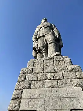 Скульптура водружена на 6-метровый постамент, облицованный сиенитом и гранитом. Постамент украшен барельефами «Советская армия бьёт врага» (автор Георгий Коцев) и «Народ встречает советских воинов» (автор Александр Занков).