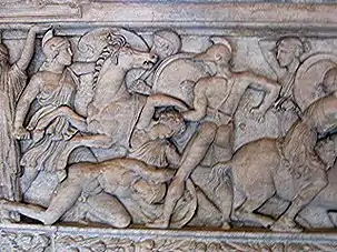 - Мирина[48]. Амазонка, её называли «легконогой» из-за быстроты управления колесницей[49]. Её курган упоминает Гомер: боги называют его могилой Мирины, а люди Батиеей[50].