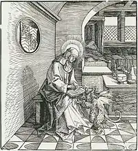 В иконографии изображается с открытой книгой и короной на голове.