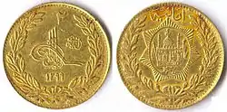 На аверсе монеты изображены тугра в лавровом венке, на реверсе дворец с тронным залом[5]. Вес амани до денежной реформы составлял 4,6 г, после — 6 г золота 900-й пробы[5].