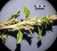 Цветки собраны в пазухах листьев или на верхушке в короткие колосовидные соцветия. Прицветники и прицветнички шиловидные, 2—2,5 мм длиной, жестковатые, острые. Листочки околоцветника около 1 мм длиной, плёнчатые. Тычиночные цветки продолговатые, тычинки длиннее околоцветника; пестичные — продолговатые или шиловидные, рыльца три.