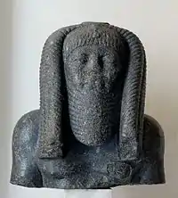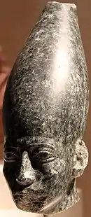![]() Голова статуи Аменемхета III в головном платке немес. Египетский музей. Берлин | |