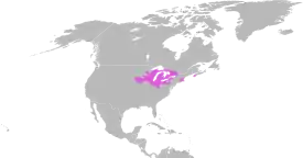 Живёт в канадских провинциях: Онтарио, Квебек, Новая Шотландия и американских штатах: Мичиган, Пенсильвания, Огайо, Индиана, Иллинойс, Висконсин, Айова, Миннесота, Небраска, Миссури, Нью-Йорк, Коннектикут, Род-Айленд, Массачусетс, Нью-Гэмпшир, Мэн.