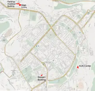 Два главных здания университета — Главный корпус и Здание Парамаза Аветисяна расположены по одному адресу — проспект Маршала Баграмяна 40, в центре Еревана.[4] Проспект Маршала Баграмяна — одна из главных улиц города, на которой также расположены Президентская резиденция и Национальное собрание Армении. Рядом с главным корпусом университета расположено посольство Великобритании. Статуя советского маршала армянского происхождения — Ивана Баграмяна (Ованеса Баграмяна), в честь которого и названа улица, была установлена перед зданием университета в 2003 году.[5][6][7]