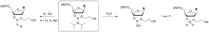 Амидофосфиты очень активно реагируют с нуклеофилами в присутствии слабой кислоты в качестве катализатора. При этом происходит протонирование атома азота, связанного с атомом фосфора, и нуклеофильное замещение с отщеплением амидной группы. Катализ сильными кислотами менее эффективен, поскольку в их присутствии происходит протонирование атома фосфора. Поскольку вода также является, амидофосфиты обычно подвержены гидролизу, особенно в кислой среде, с образованием гидрофосфатов (H-фосфонатов).[1]