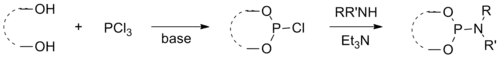 Амидофосфиты синтезируют в две стадии из PCl3, спиртов и аминов. Поскольку обе стадии протекают с выделением HCl, на каждой из них используется основание. Порядок стадий может быть изменен.[1]