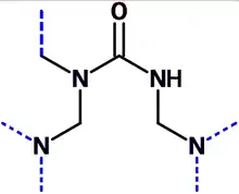 Реакция взаимодействия альдегида или амида с соединениями, содержащими аминогруппы, протекает в две стадии. На первой так или иначе образуются метилольные соединения и их производные. На следующей эти метилольные соединения вступают между собой или со свободными атомами водорода в реакцию поликонденсации, в результате которой образуется смола. При дальнейшем нагревании смола необратимо твердеет, образуя нерегулярно разветвленный трехмерный сшитый полимер, что и позволяет использовать её в качестве материала.