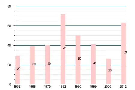 | 1962 | 1968 | 1975 | 1982 | 1990 | 1999 | 2004 | 2006 | 2009 | 2011 | 2012 |
