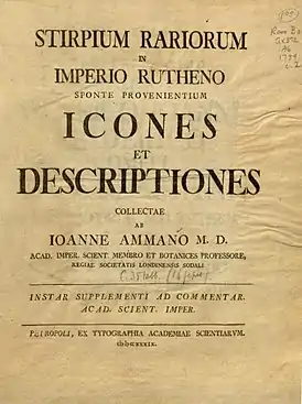 - Stirpium rariorum in Imperio Rutheno sponte provenientium icones et descriptiones / Collectae ab Joanne Ammano, M. D. Acad. Imper. scient. membro et botanices professore, Regiae Societatis Londinensis sodali; Instar supplementi ad Commentar. Acad. scient. Imper. Petropoli [St. Petersburg]: Ex Typographia Academiae scientiarum. 1739. [12] + 210 + [13] p., [34] tab.
