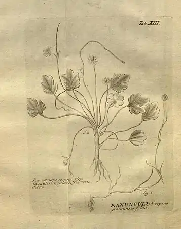 Лютик ползучий. Ботаническая иллюстрация из книги Stirpium rariorum … ab Ioanne Ammano.