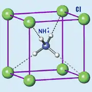 В аммоний-катионе NH4+ все четыре связи равноценны и неразличимы, поэтому считается что электрический заряд в катионе делокализован (рассредоточен) по всему комплексу. Размер аммоний-катиона NH4+ составляет 1,43 Å[3]. В кристалле хлорида аммония аммоний-катион NH4+ окружают восемь ионов хлора (рис.2). Параметр кристаллической решётки 3,8758 Å.[4].