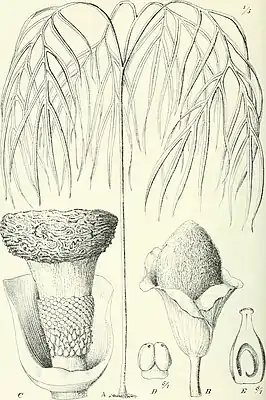 Мужские цветки 1—1,5 мм длиной, 1,5 мм шириной; пыльники нерегулярно кубические, свободные, менее 0,5 мм длиной; поры верхушечные, по две округлые поры заметны на каждом теке; связник широкий, фиолетовый. Пыльца оранжевая, с шипами, 23,6—34,8 мкм длиной, 23,6—28,1 мкм в диаметре, округлая.